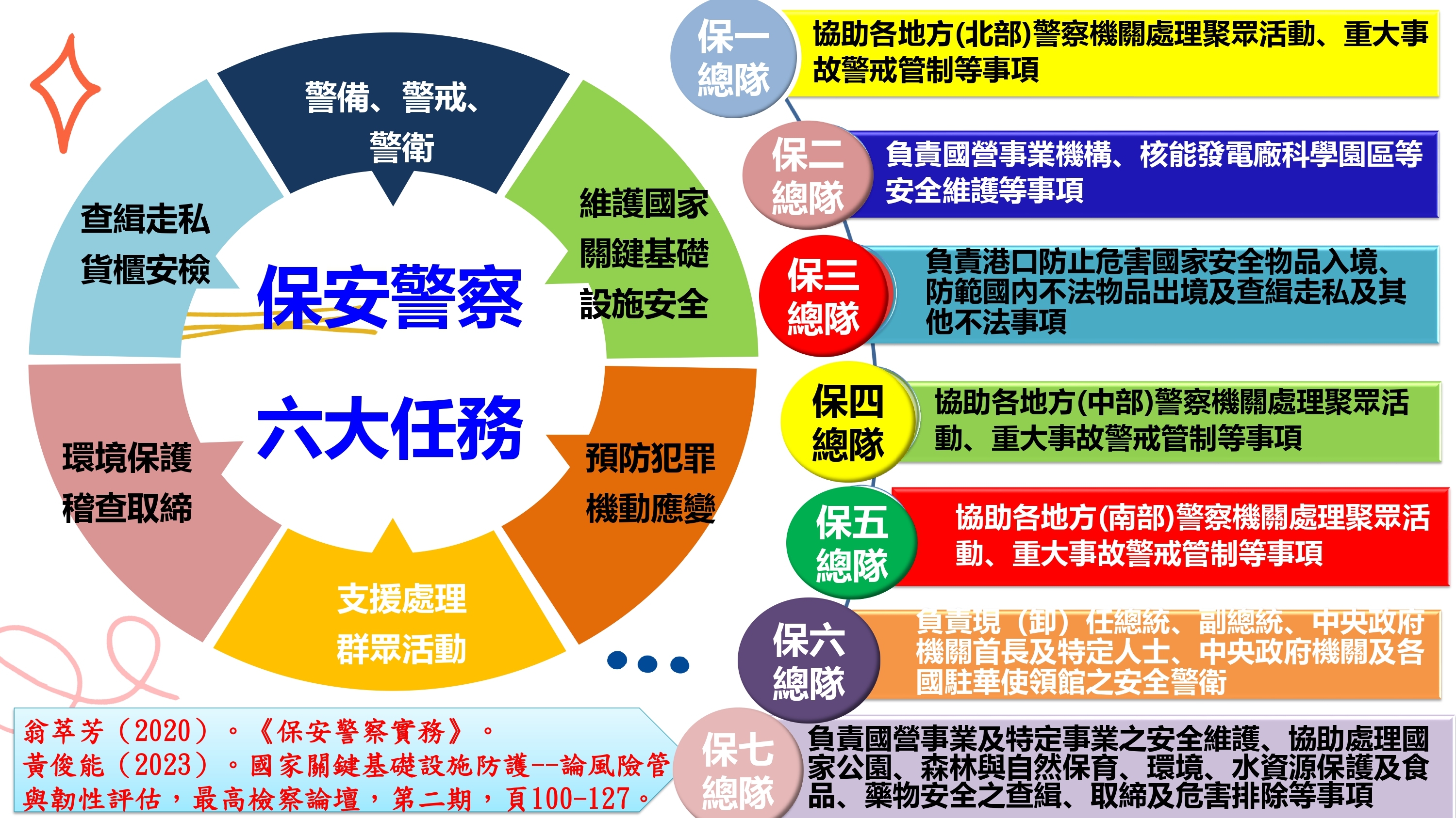 (一)屬於警備、警戒、警衛等特定警衛性質的全國性保安警察作用,即「警察法」第5條第1款所列由內政部警政署所(司)掌理之「關於拱衛中樞、準備應變及協助地方治安之保安警察業務」。執行本項工作者,稱之為保安警察人員,亦俗稱為保安警察,例如各保安警察總隊人員,保安警察的勤務主要體現在維護特定場所、人員和設施的安全,並預防犯罪、應對突發事件。負責警衛任務,包括對重要人物、政府機構、外國使館等進行安全維護,同時也參與維護社會治安、支援地方警力等工作。綜上,保安警察,依照警察法及其施行細則、內政部警政署保安警察總隊組織準則規定,關於拱衛中樞、準備應變,及協助地方治安之保安警察業務、管理出入國境之國境警察業務及關於防護森林等事業設施之各種專業警察業務。是我國為預防犯罪、機動應變,協助地方警察機關,支援處理群眾活動(保一、四、五總隊)、專業機關偵辦刑案(保三、保七總隊)及執行反恐任務攻擊等重大治安事件(保一總隊維安特勤隊),並維護重要人士、設施、處所安全(保六總隊)及國家關鍵基礎設施(保二總隊)。